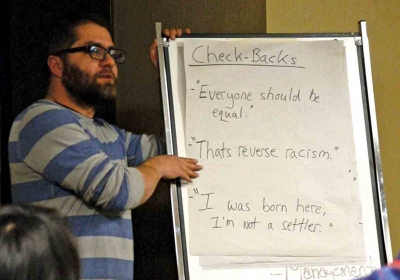 Mishkeegogamang’s Erin Bottle led a small group of people to the Landmark Inn on March 21 to demand an apology from gift shop owner Tamara Ward Johnson. Bottle also called for a public boycott of her business over comments made on social media over the last few weeks.