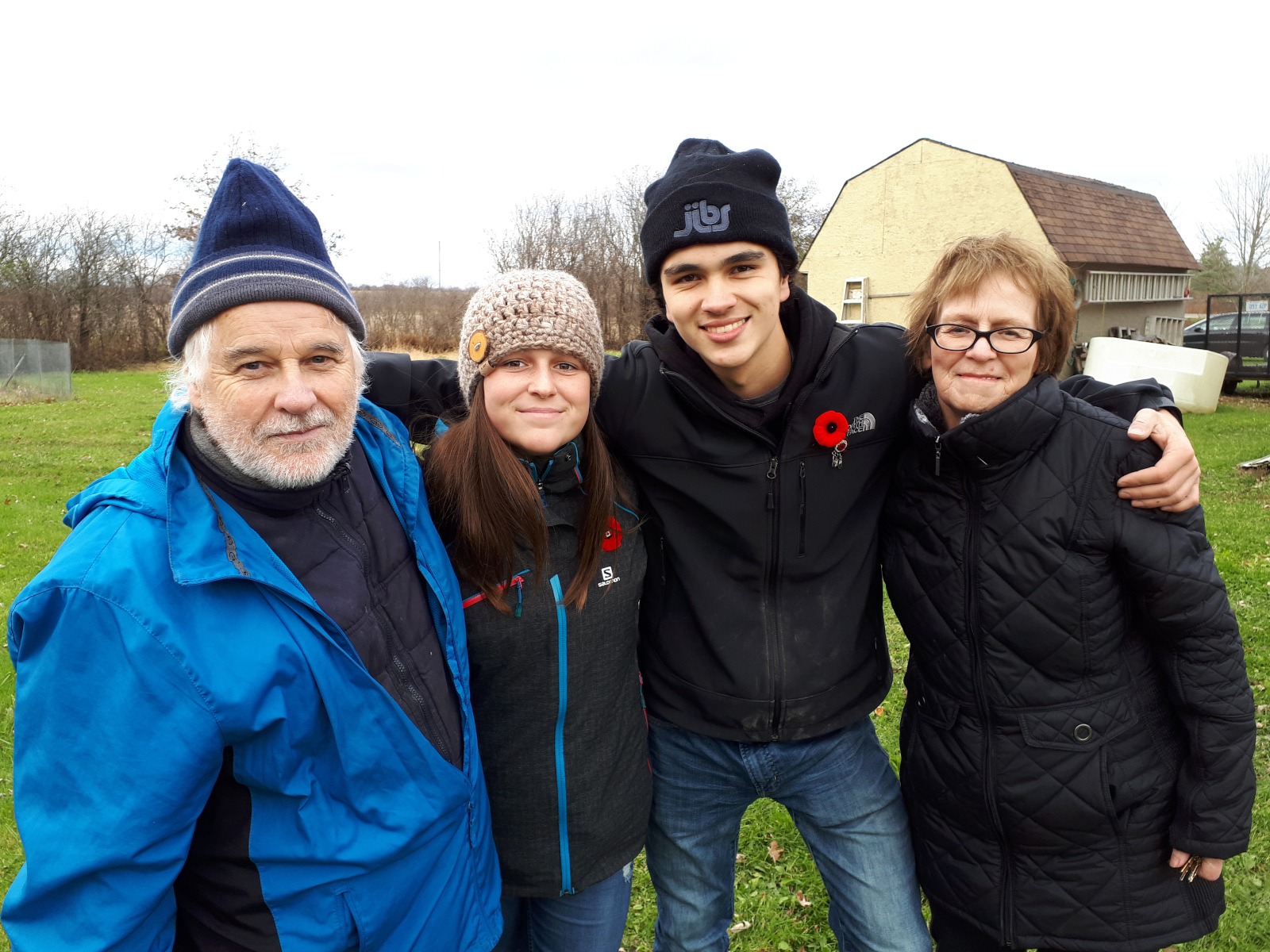Photo 2: Mike McGrath on his many visits to Hagersville, Ontario to see his sister and her two grandchildren. From L-R are: Mike McGrath, Brynn Vokes, Jack Vokes and Mike’s sister Patty Bradley. (Photo by Xavier Kataquapit)