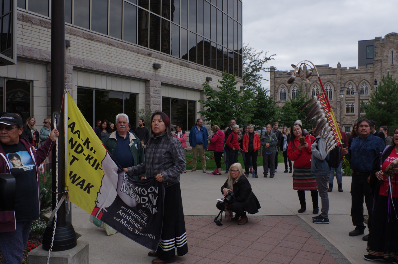 Full Moon Memory Walk organizer Sharon Johnson prepares to raise the Full Moon Memory Walk flag at Thunder Bay City Hall at the beginning of the Sept. 6 walk to where her sister Sandra was found murdered in 1992 on the Neebing-McIntyre Floodway. Photo by Rick Garrick.