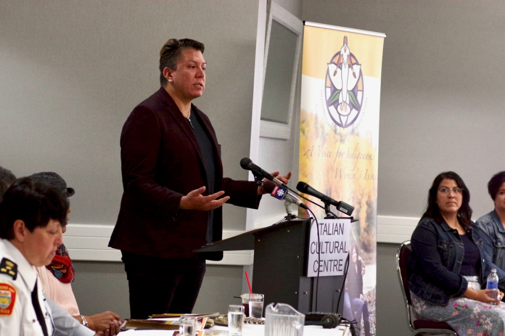 Ontario Native Women’s Association staff member Collin Graham explains how ONWA's Journey to Safe SPACES: Indigenous Anti-Human Trafficking Engagement Report is the first of its kind during its release in Thunder Bay. Photo by Rick Garrick.