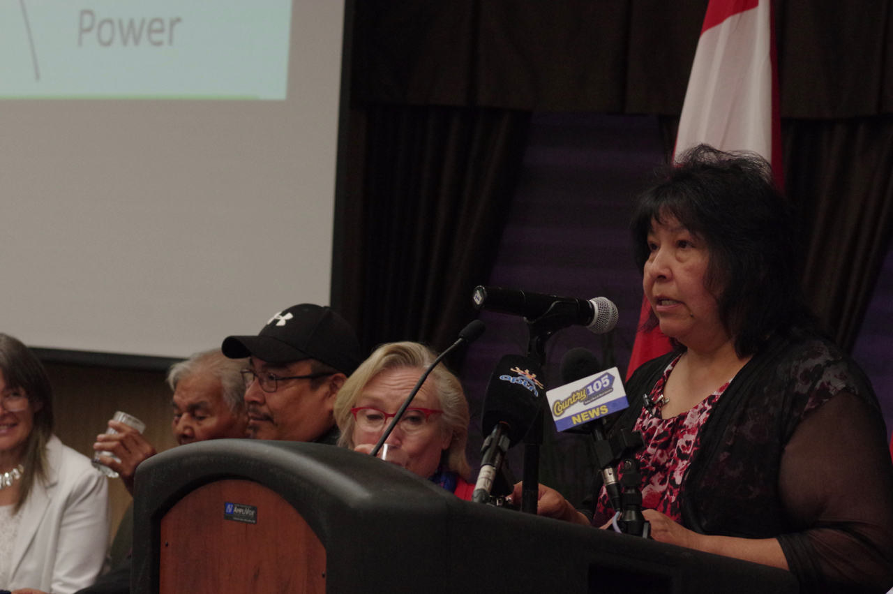 Wataynikaneyap Power CEO Margaret Kenequanash speaks during the announcement of the Wataynikaneyap Power transmission line. Photo by Rick Garrick.