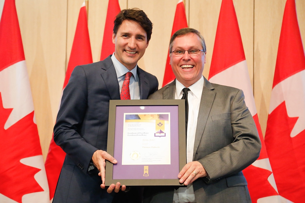 Thomas Doherty, a teacher with the Keewaytinook Okimakanak Board of Education has been recognized by the Prime Minister’s Awards (PMA) for Teaching Excellence. Mr. Doherty is one of eleven national-level recipients who received the 2016/2017 PMA for Teaching Excellence Certificate of Excellence from Prime Minister Justin Trudeau at an awards ceremony held in Ottawa May 03, 2017 to celebrate Canada’s top teachers and early childhood educators. This is the national level award and is considered the highest honour for teachers and early childhood educators in Canada. Recipients are honoured for their remarkable achievements in education and for their commitment to preparing their students for a digital and innovation-based economy.