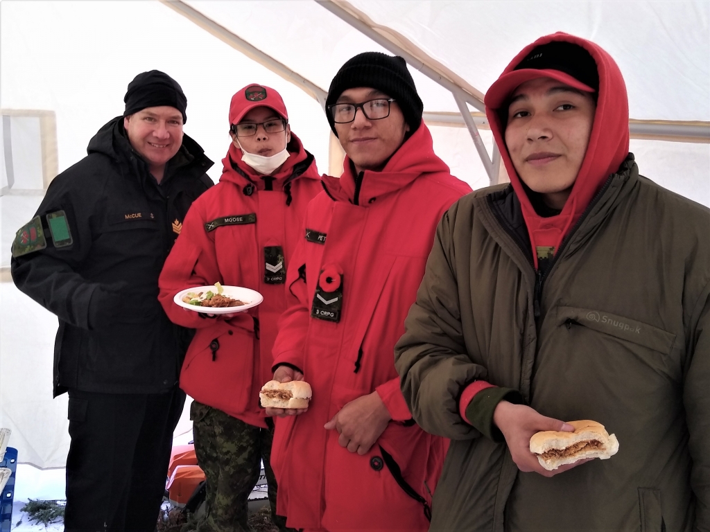 Taking a quick snack between Ranger duties are, from left, Petty Officer Second Class Kevin McCue, an instructor, Corporal Sandi Moose, Ranger Clayton  Peters, and Corporal Eli Owens. (Photo: Canadian Rangers)