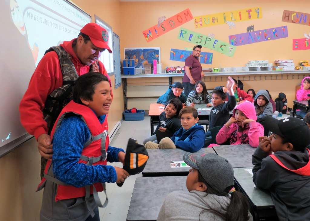 During their distribution in Kashechewan Ranger Redfern gave 30-minute educational presentations to the grade one to 12 students in both the junior school and high school. He spoke to them in Cree and English and used a PowerPoint presentation that included dramatic video. He started each presentation by asking the students if they could swim or if they owned a life jacket. Often only a couple of hands went up.