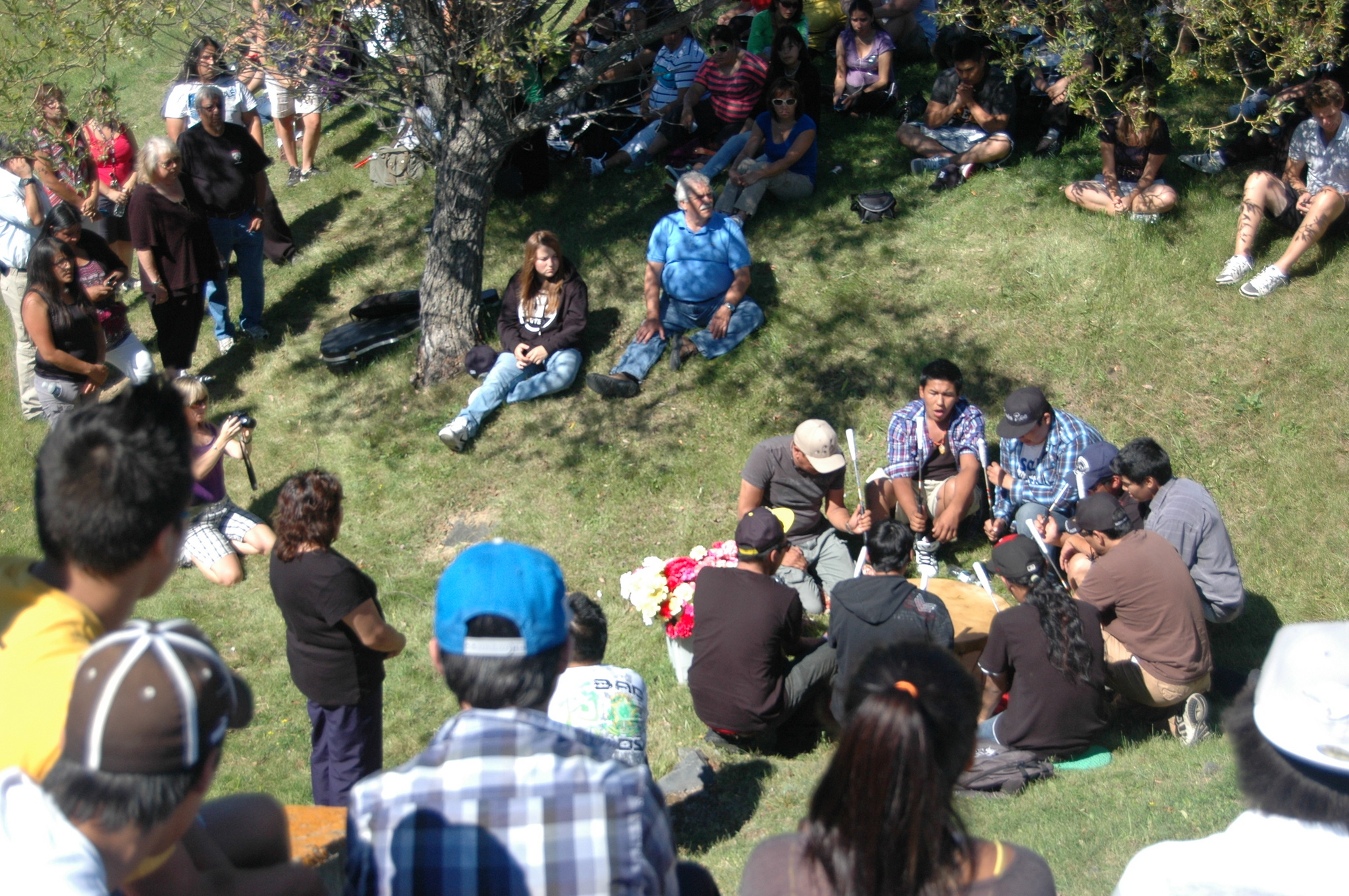Standing along the McIntyre River, staff and students of the Dennis Franklin Cromarty High School (DFC) prayed and offered tobacco in honour of the northern youth who died in Thunder Bay.