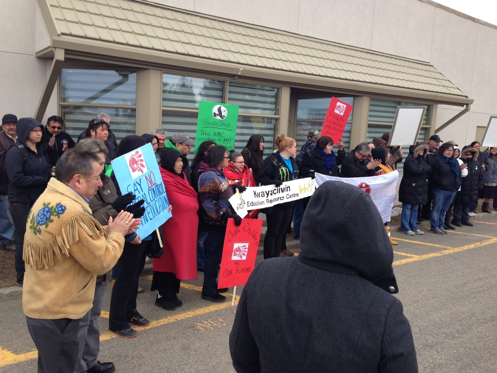 As federal government officials met with what Ontario Regional Chief Stan Beardy called “a small number of chiefs” about the First Nations Education Act in Thunder Bay, dozens of people protested outside the consultation meeting.