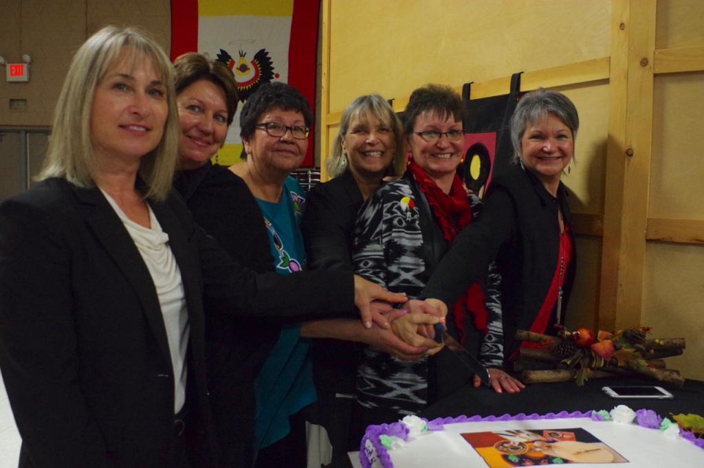 Justice Joyce Elder, Justice Joyce Pelletier, Frances Wesley, Celina Reitberger, Charlene Baglien and Rosanna Hudson celebrate the opening of the Indigenous Peoples’ Court with the cutting of a cake at the Ka-Na-Chi-Hih Specialized Solvent Abuse Treatment Centre in Thunder Bay.