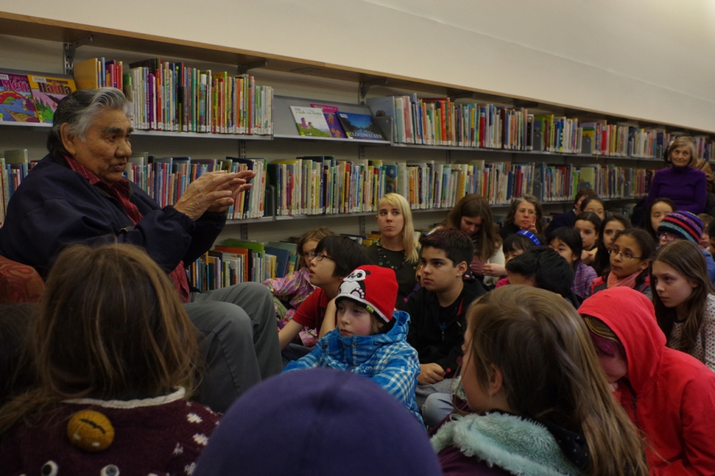 Peawanuck storyteller Louis Bird shares his stories with a group of students and adults during the April 7 Storytellers from Away: Louis Bird event at the Toronto Storytelling Festival. Photo by Rick Garrick.