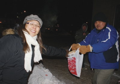 Tina Sainnawap braved the coldest night of the year to deliver raisin bannock, juice and warm hats and gloves to people on the streets of downtown Thunder Bay.