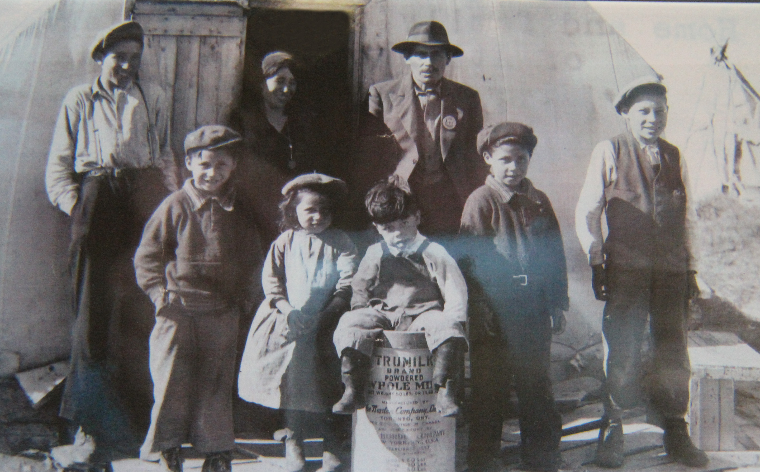 This faded historical photo features my grandfather James Kataquapit who was Chief of Attawapiskat in 1945. Here we see him standing with a hat and pin signifying his leadership. His wife Janie Kataquapit is standing at the door. Chief Kataquapit was also a veteran of the First World War. From L-R are his children: Thomas, Marius, Celine, David, Gabriel and Alex. Missing are brothers George and Leo.