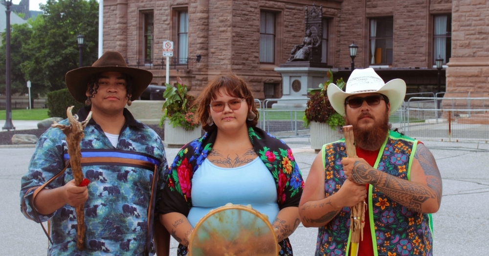 First Nation youth movements held a rally at Queen’s Park in Toronto on Friday August 8, 2025 to welcome the arrival of youth walkers from Timmins, Ontario. From L-R are: Ramon Kataquapit, Okiniwak; Keira Spence, Youth Rising Together and Tristan Ashishkeesh, Mahmo Inninuwuk Wiibuseego-stamok.