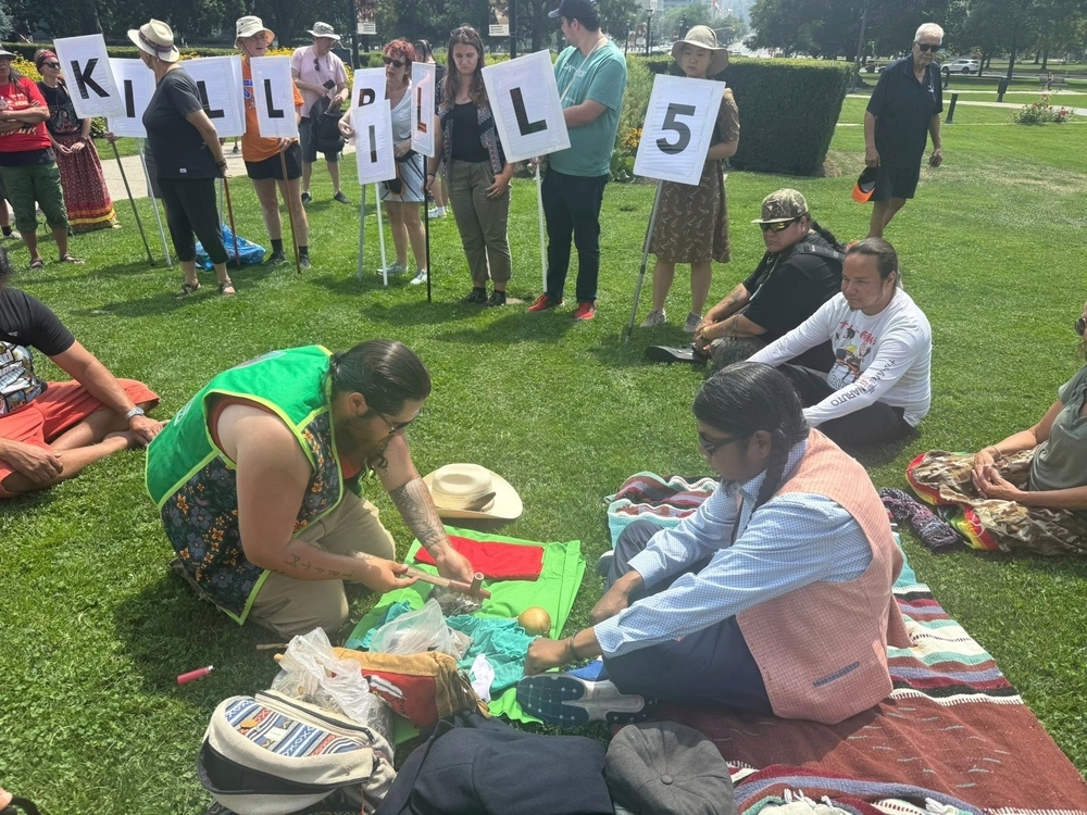 A First Nation Youth Rally was held against Ontario’s Bill 5 and Canada’s Bill C5 at Queen’s Park in Toronto on August 8, 2025. Pictured L-R are: Tristan Ashishkeesh, Mahmo Inninuwuk Wiibuseego-stamok and his grandmother Elder Angela Ashishkeesh.