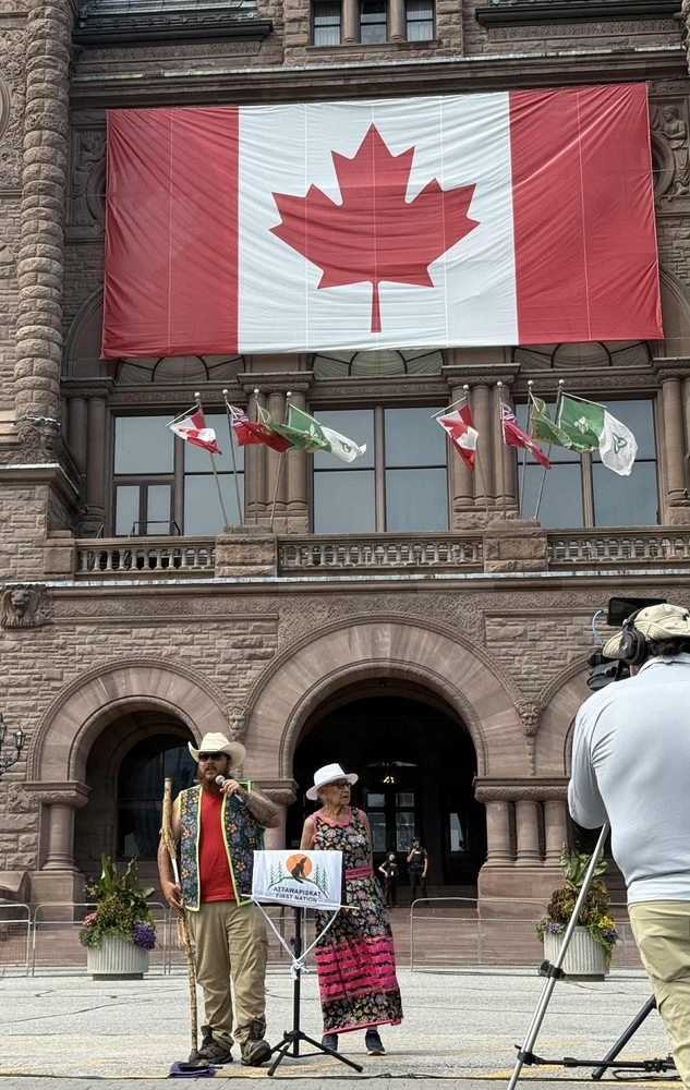 Elders and First Nation political leaders attended a First Nation youth rally at Queen’s Park in Toronto against Ontario’s Bill 5 and Canada’s Bill C5 on August 8, 2025. From L-R: Tristan Ashishkeesh, Elder Angela Ashishkeesh, Ramon Kataquapit and Elizabeth Spence-Etherington.