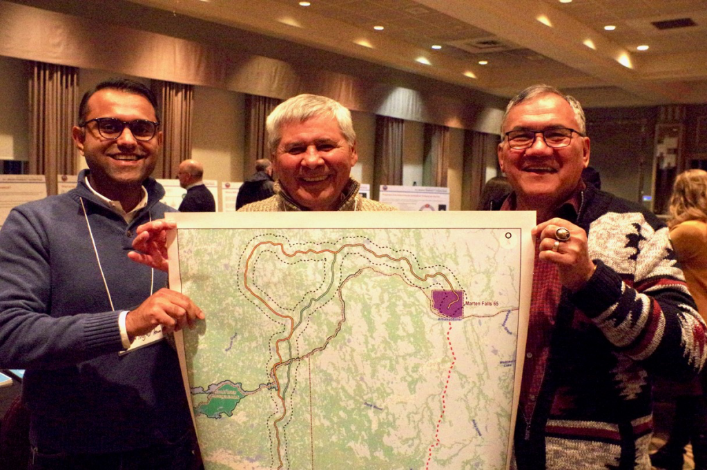 Qasim Saddique, Lawrence Baxter and Bob Baxter hold up a map of some of the possible Marten Falls all-season Community Access Road routes during a Public Information Centre session at the Valhalla Inn in Thunder Bay.