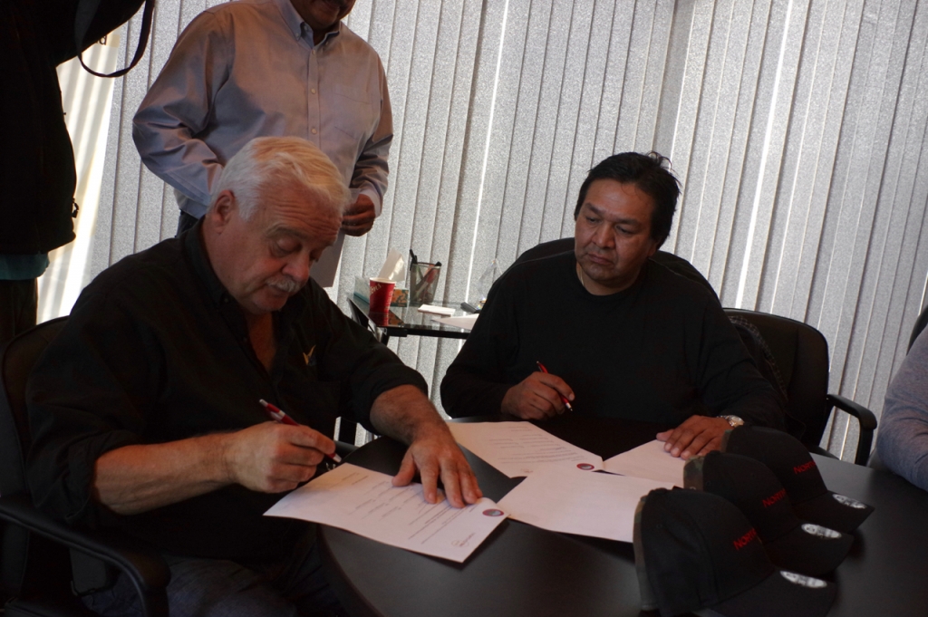 North Star Air president and CEO Frank Kelner and Marten Falls Chief Bruce Achneepineskum sign a strategic business agreement, which includes a revenue sharing agreement and the introduction of flights between Thunder Bay and Marten Falls beginning on Oct. 16, on Sept. 27 in Thunder Bay. Photo by Rick Garrick.