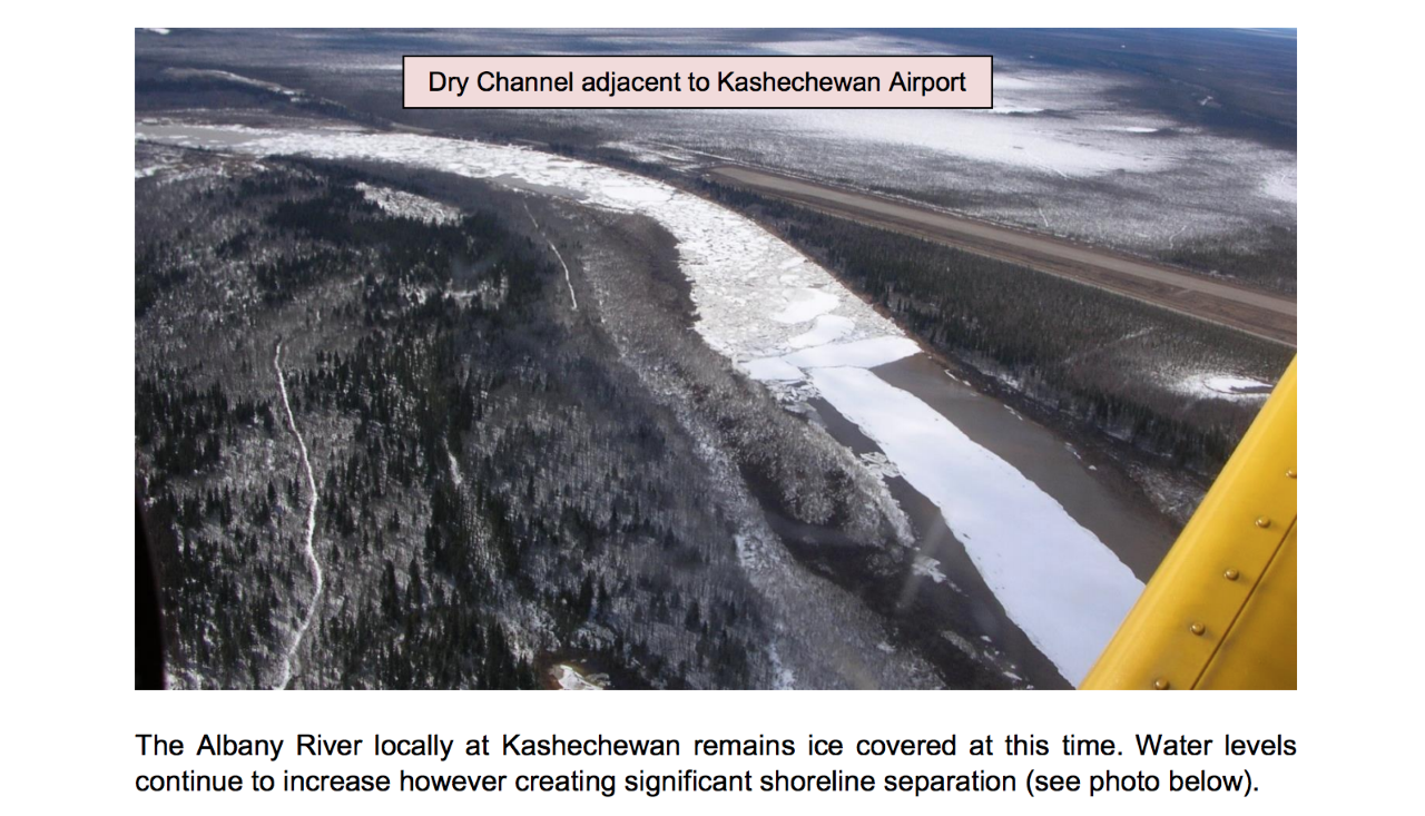 A Ministry of Natural Resources and Forestry Mushkegowuk Council Emergency Management Services Emergency Management Bulletin photo shows the Albany River water levels near the Kashechewan Airport on May 7. Screenshots from Ministry of Natural Resources and Forestry Mushkegowuk Council Emergency Management Services Emergency Management Bulletin.
