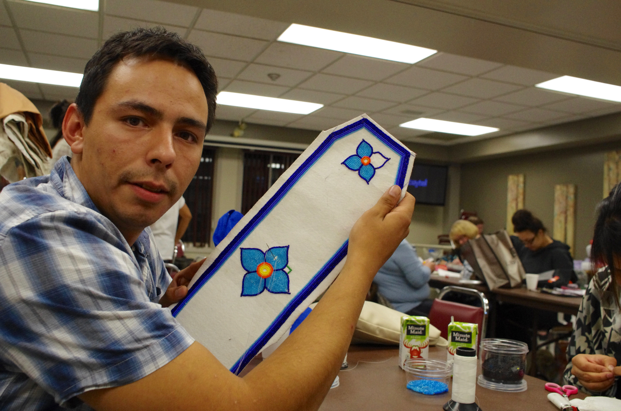 Ignace is currently working on the beadwork for his regalia at the weekly Sewing Spirits gathering, which is held on Wednesday evenings at the West Thunder Community Centre in Thunder Bay.