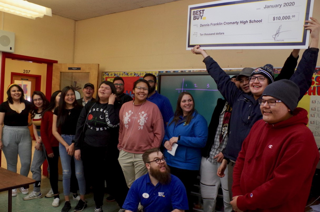 A group of Dennis Franklin Cromarty First Nations High School students celebrated the presentation of a $10,000 STEM Tech Grant by a group of Best Buy staff in math teacher Alyssa Saj’s classroom.