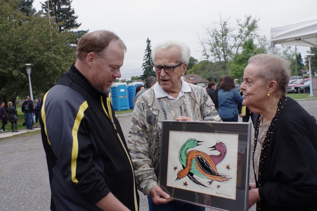 Matawa Learning Centre principal Brad Battiston accepts a Morley Kakepetum painting from Stan and Peggy Dromisky, who live across the street from the Matawa Education and Care Centre, during the Matawa Education and Care Centre Neighbourhood Barbeque on Sept. 15 in Thunder Bay. Photo by Rick Garrick.