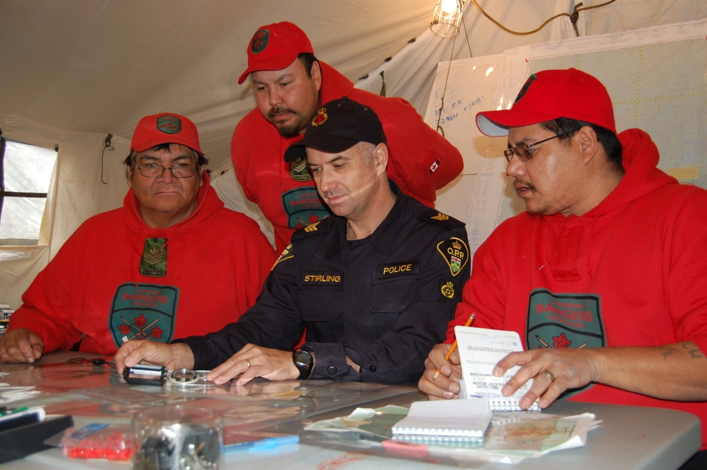 Deputy Chief Roland Morrison and Inspector Merle Loon from Nishnawbe-Aski Police Service visited the exercise command, which was run by Canadian Rangers, and were both impressed at the Rangers ability to assist their officers in searches.