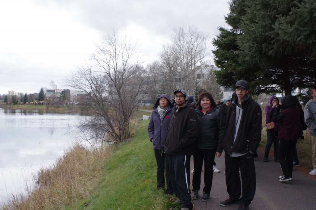 The lead group of A Day to Remember walkers wait for the rest of the walkers to catch up along the McIntyre River during the Nov. 1 walk for the seven Nishnawbe Aski Nation high school students who died in Thunder Bay from 2000-2011. Photo by Rick Garrick.