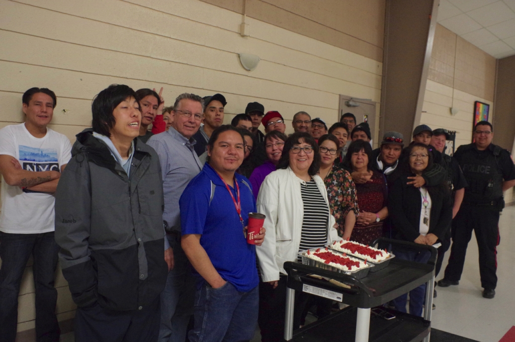Ka-Na-Chi-Hih Specialized Solvent Abuse Treatment Centre’s Sarah Simon, in white jacket, celebrated her retirement on April 23 with two of her children and the staff and clients at the Thunder Bay-based treatment centre. Photo by Rick Garrick.