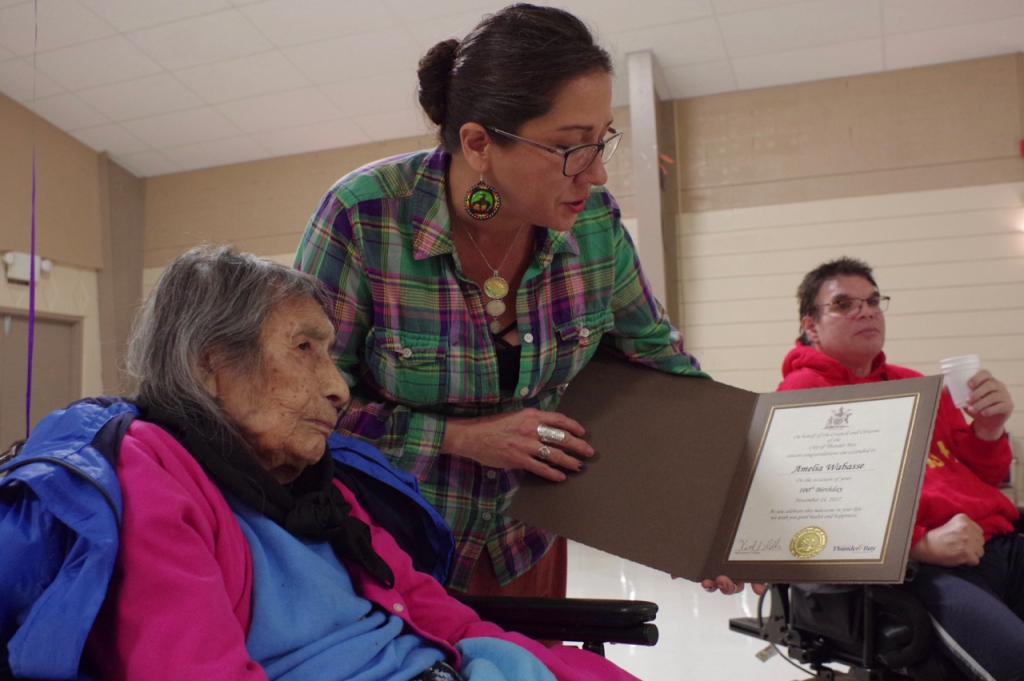 Nibinamik Elder Amelia Wabasse was recognized by the City of Thunder Bay on Nov. 17 for the occasion of her 100th birthday during Anishnawbe Mushkiki’s Fall Feast at the Ka-Na-Chi-Hih Specialized Solvent Abuse Treatment Centre in Thunder Bay. Photo by: Rick Garrick.