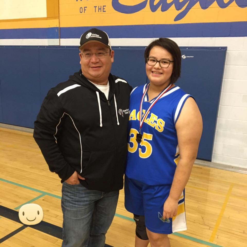 Justice Bruyere of Wabigoon Lake Ojibway Nation celebrates another sporting victory with her father, Tyson Gardner, by her side (Photo by: Michelle Bruyere)