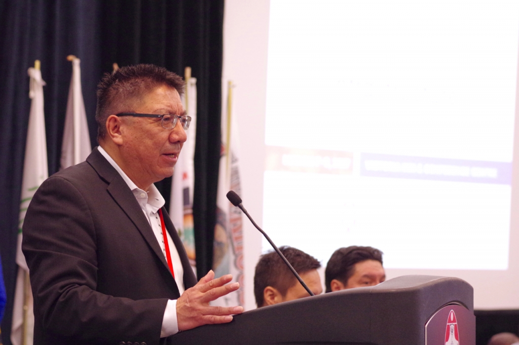 Grand Chief Alvin Fiddler speaks about infrastructure needs across Nishnawbe Aski Nation, including the possibility of building an all-season road network, at the start of the NAN Infrastructure Summit, held March 7-8 at the Victoria Inn in Thunder Bay.