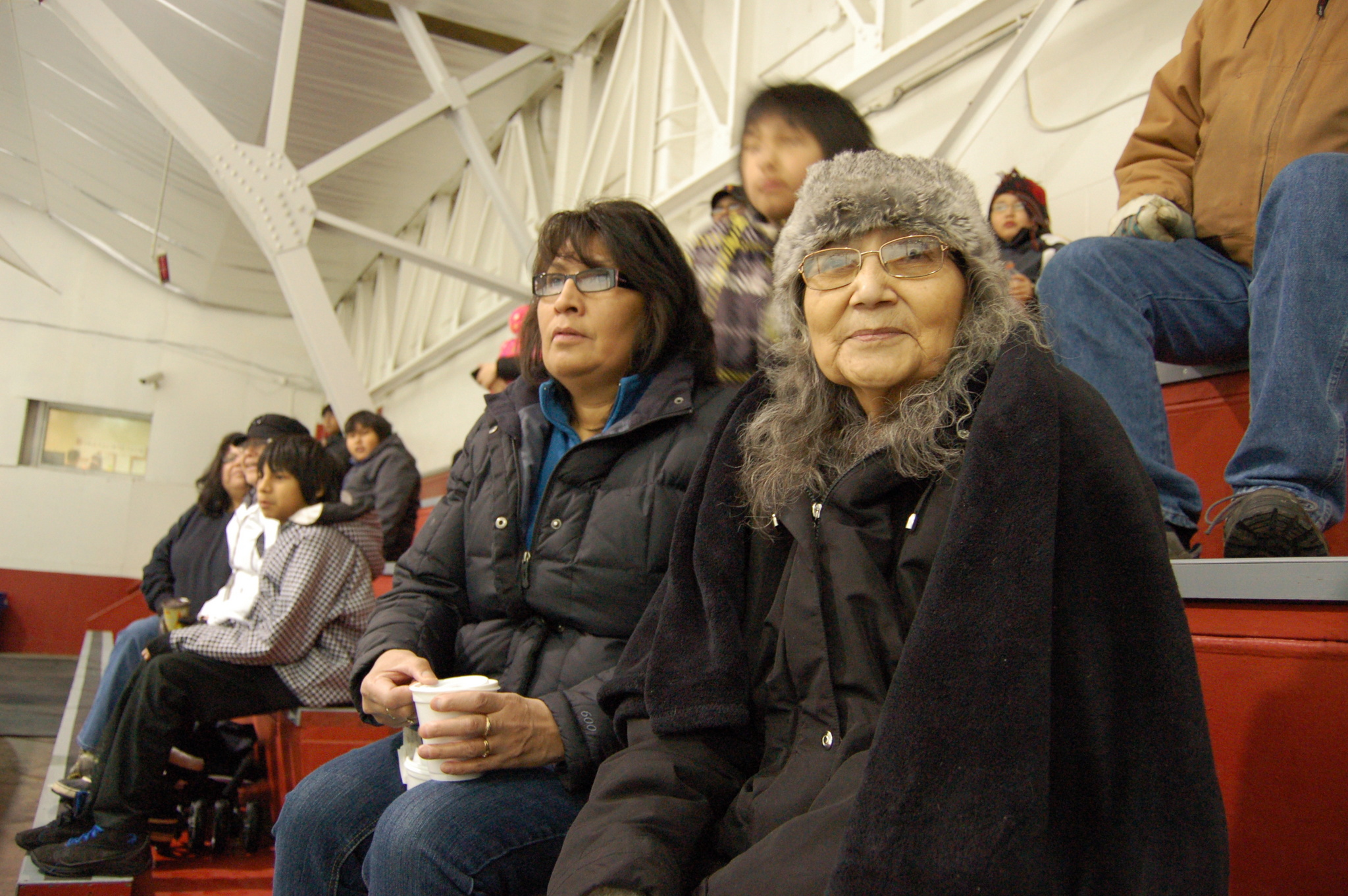 Warmed by a blanket and a cup of coffee, Tait sits in the bleachers at the Sioux Lookout Memorial Arena, where she has just watched a Hawks victory during the March tournament.